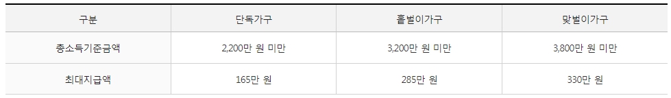 1) 총소득 금액 : 아래 가구 구성원에 따라 아래표의 총소득기준금액 미만이어야 한다.