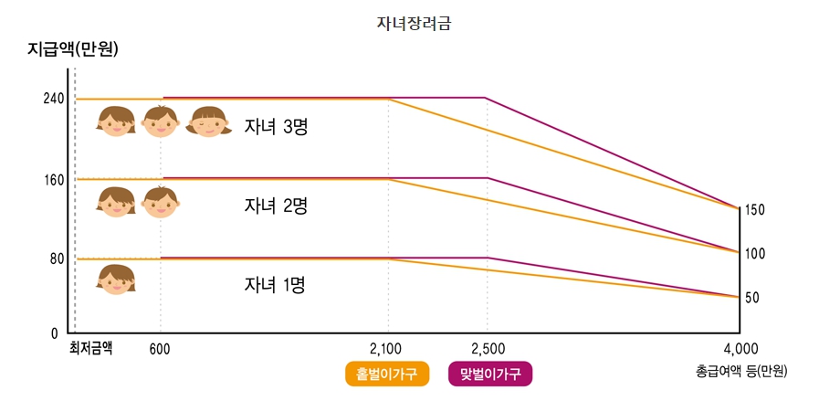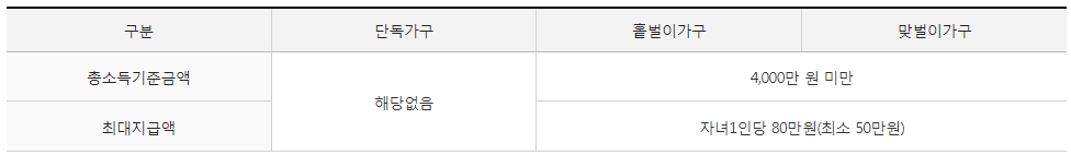 소득이 적은 자녀양육 가구에 대해서 양육비를 지원하는 제도입니다. 총소득(부부합산) 4,000만원 미만이고 18세 미만 자녀가 있으면 1인당 최대 80만원(최소 50만원)을 지급합니다. 총소득 외 나머지 수급요건은 근로장려금과 같습니다.