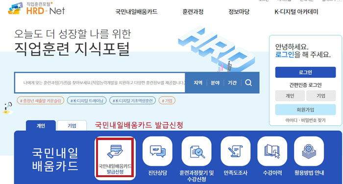 국민내일배움카드를 신청하려면 HRD-Net 홈페이지에서 회원가입을 하고, 국민내일배움카드 신청 메뉴에서