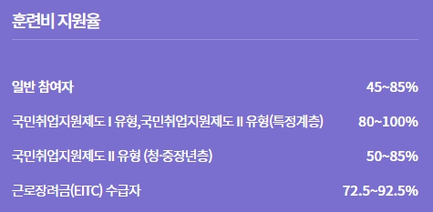 일반참여자는 45 ~ 85% 까지 지원하며 국민취업지원제도에 따라 100%까지 다양하게 지원됩니다.